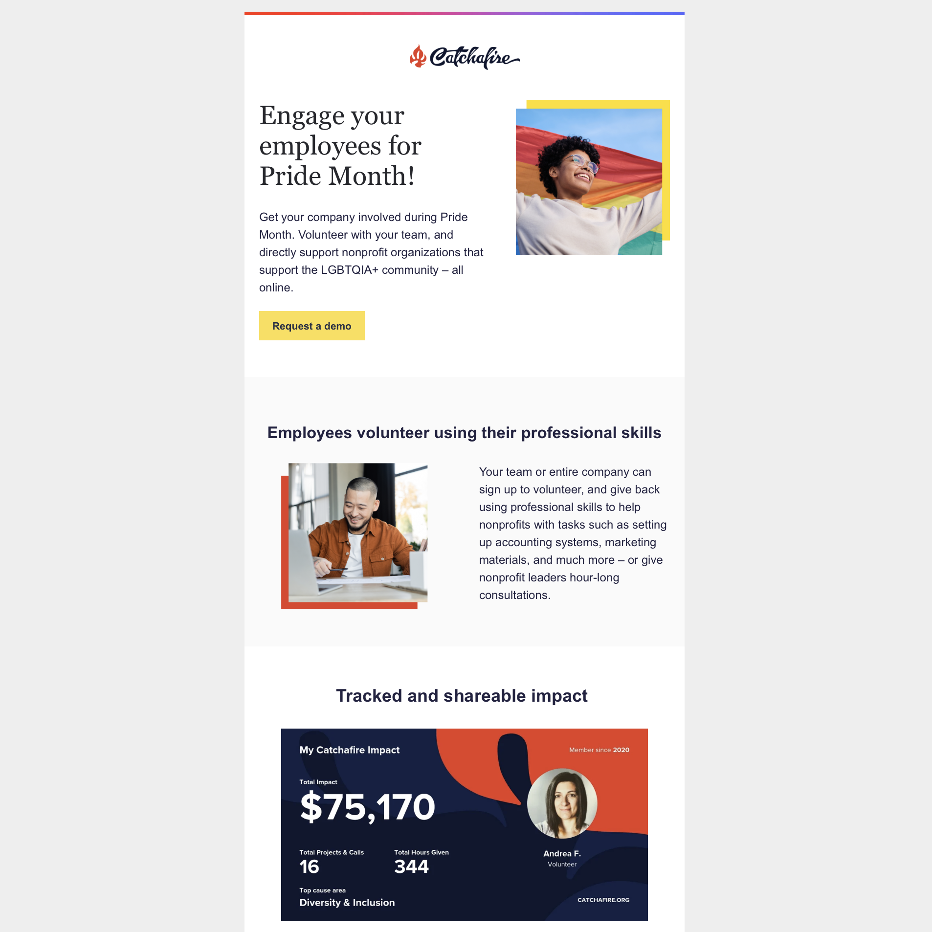 At Catchafire, I developed campaign briefs, planned monthly topical campaigns, delegated work to other team members, designed emails, landing pages, and riskiest assumption tests, and took lead on reporting and outcomes to measure the efficiency of campaigns. The goal of each campaign was to increase monthly website traffic, increase active users on the platform, and "balance out" the amount of nonprofits requesting volunteer support, with enough volunteers to meet their demand.