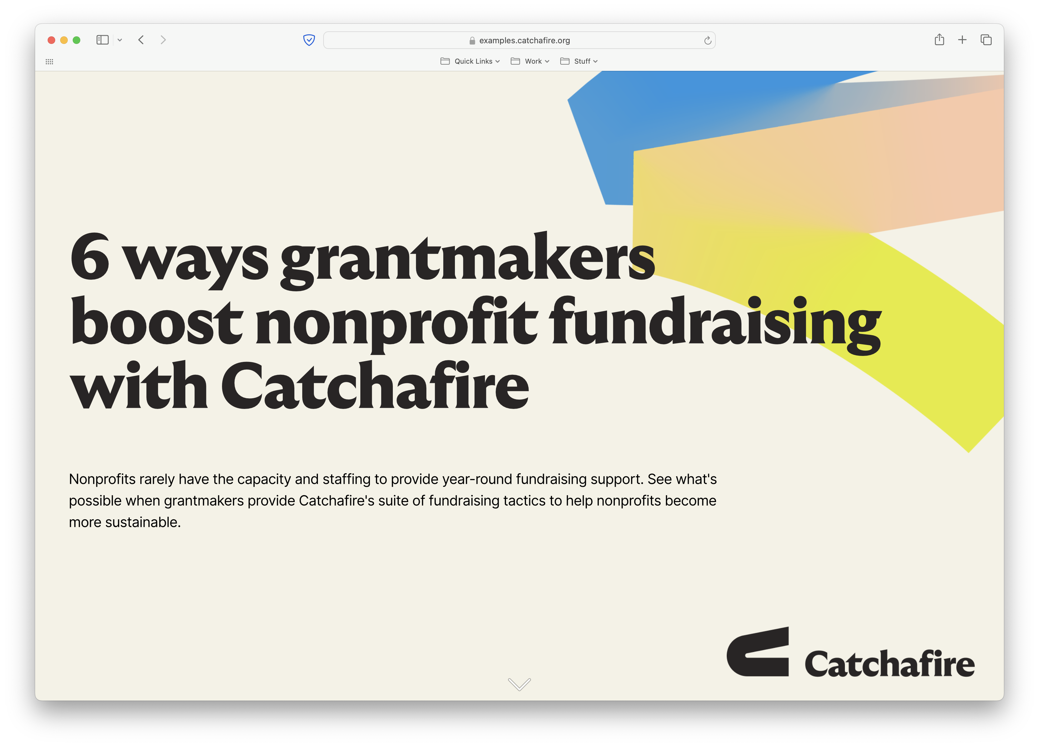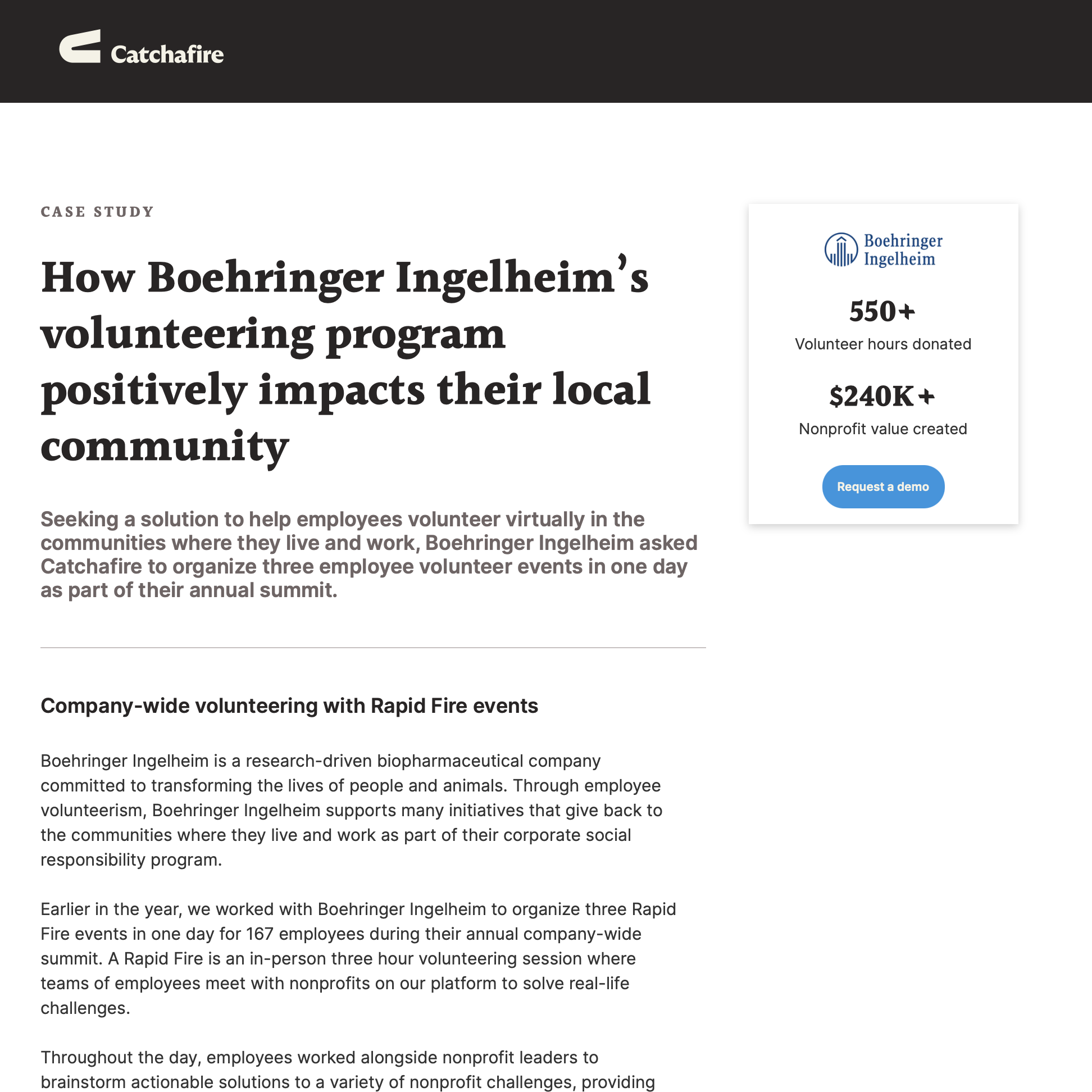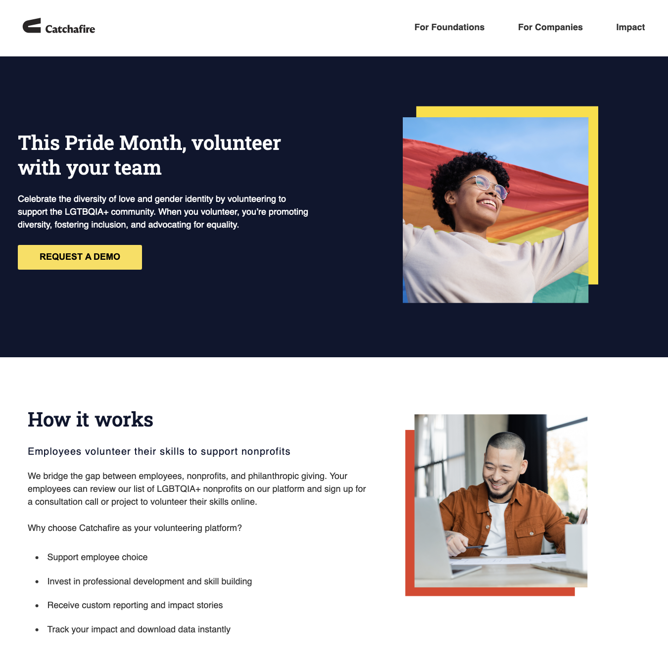 At Catchafire, I developed landing pages as needed for monthly topical campaigns. Nonprofit fundraising is cyclical in nature and centered around GivingTuesday and end-of-year giving. The content I created emphasized how volunteers can support nonprofit fundraising, by showcasing examples of completed work and impact created, testimonials from volunteers and nonprofits, and the ease-of-use of the platform.