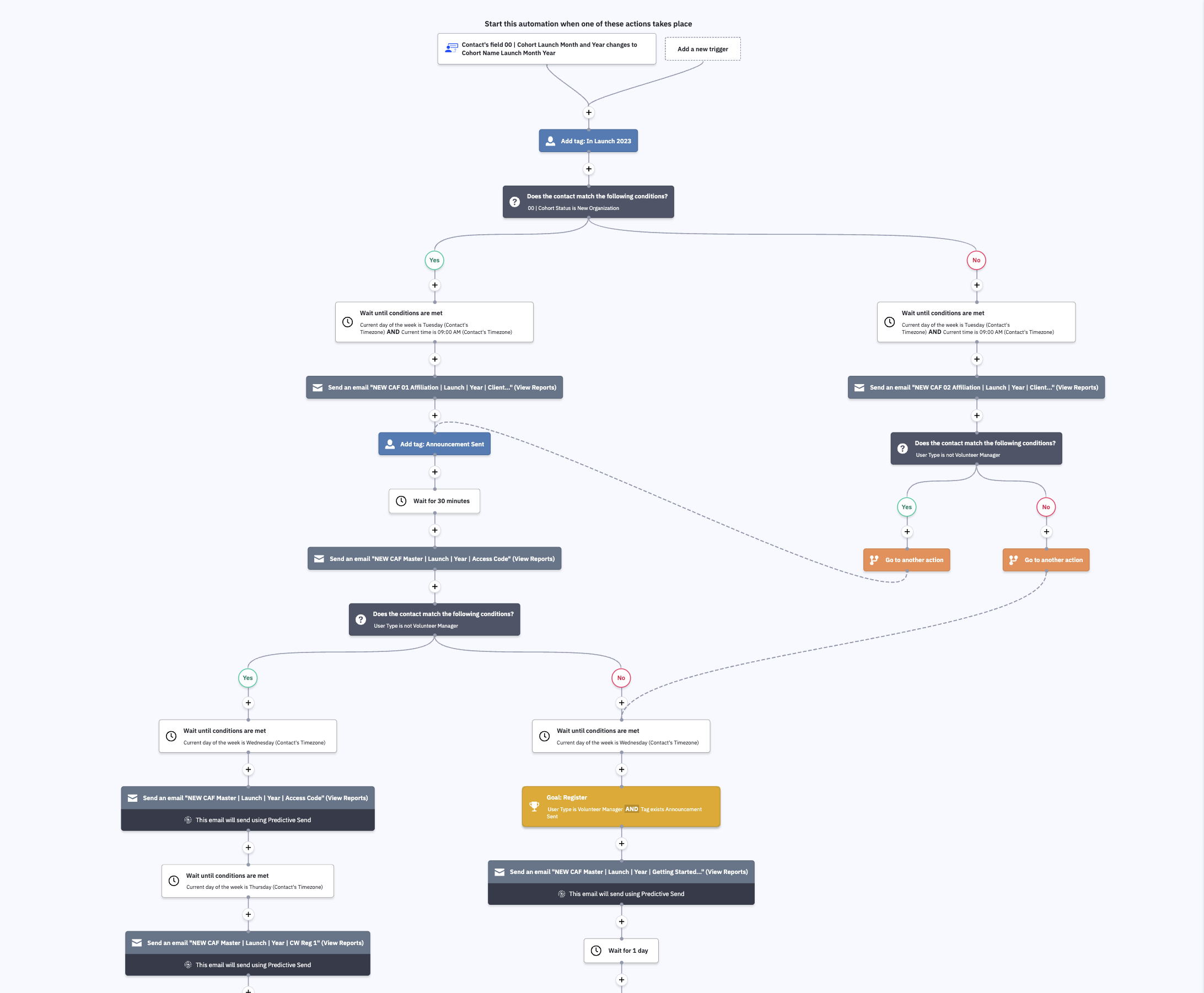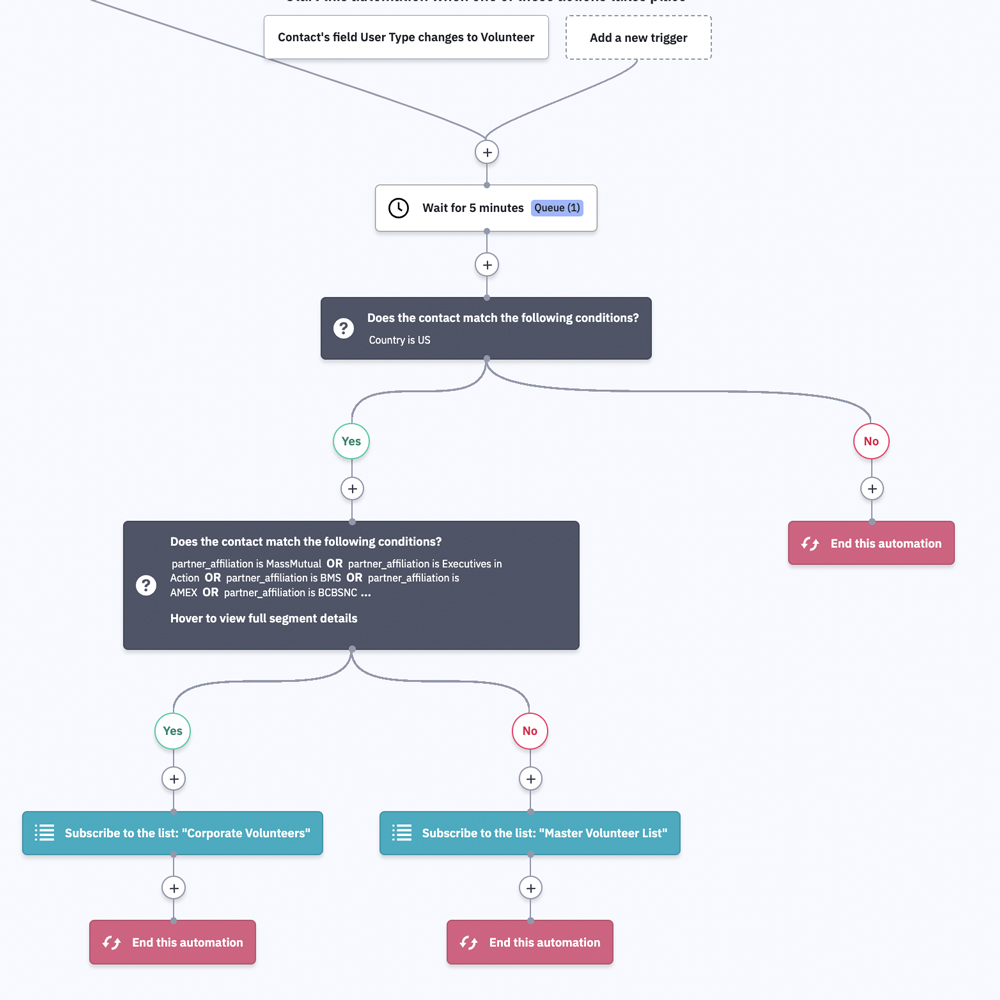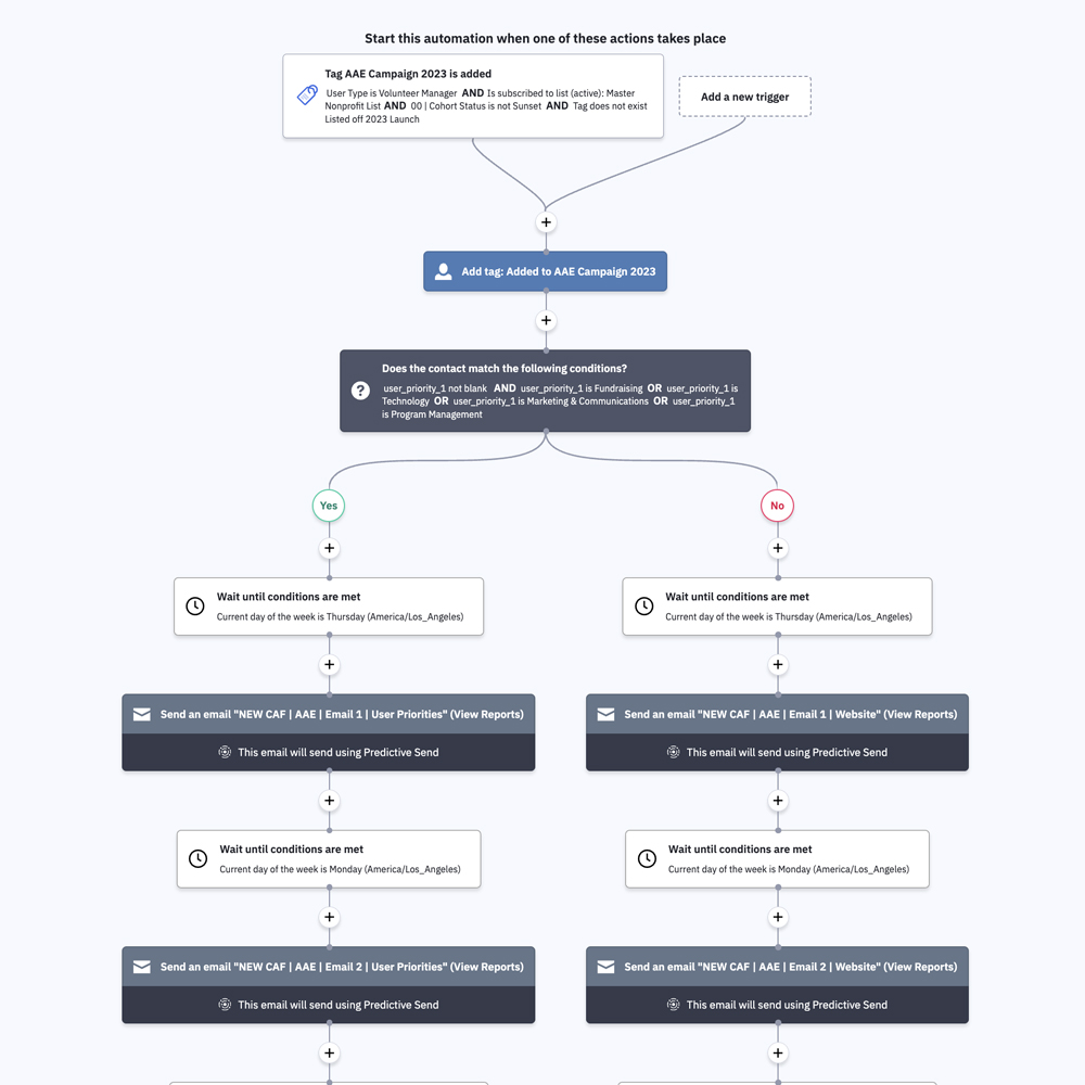 The onboarding workflow in ActiveCampaign that I developed, along with the emails I wrote and designed, increased nonprofit registration rate from ~70% to ~90%, and nonprofit project listings from ~20% to ~30%.