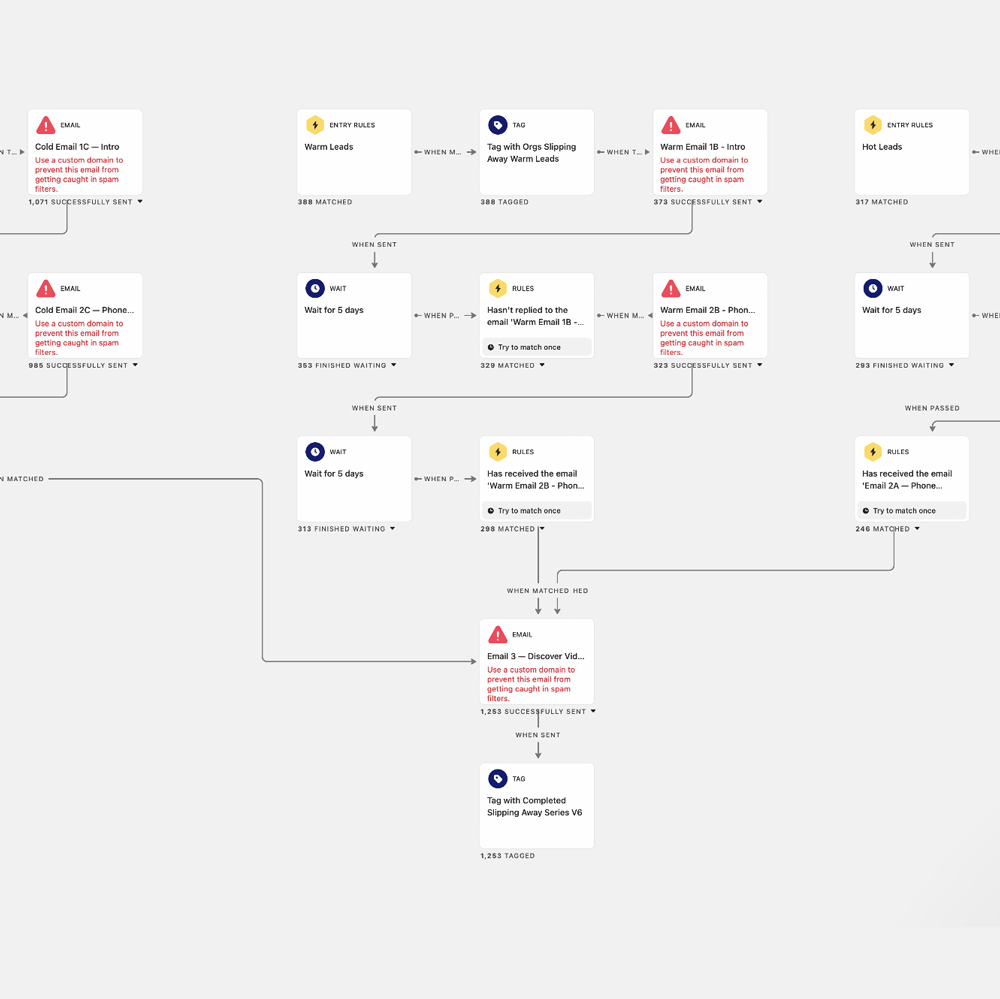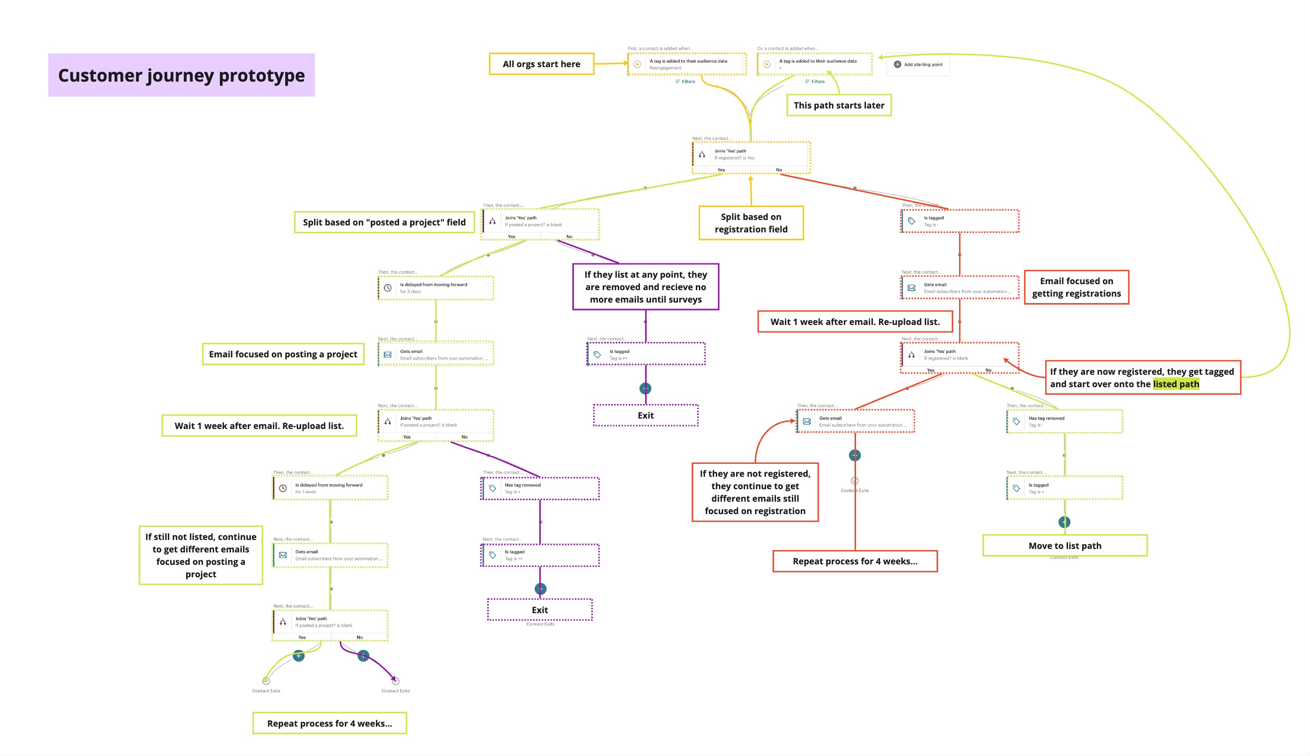 When we switched from MailChimp to ActiveCampaign, I prototyped a workflow automation in Miro. The workflow automatically sends emails based on user data and the user journey to onboard new nonprofit users when they're provided access to Catchafire.