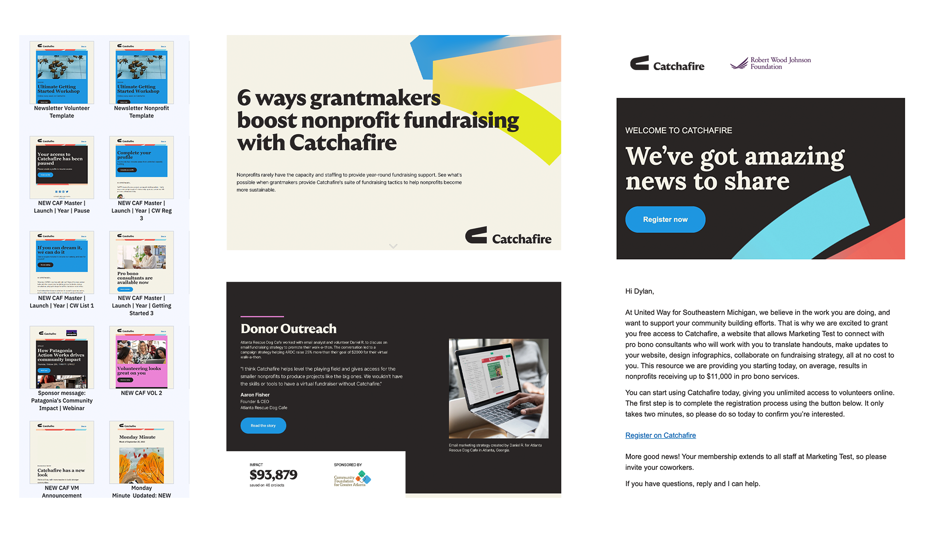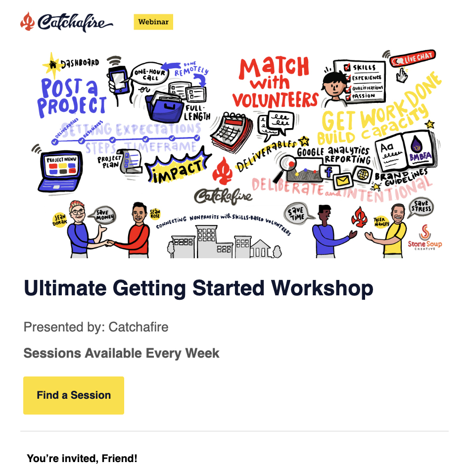 Because nonprofits are provided free access to the platform by a foundation sponsor, I developed an onboarding series that leveraged emails sent on behalf of their foundation sponsor (with permission) to build trust, paired with automated emails sent from Nonprofit Advisors at Catchafire, integrated with Google Sheets to streamline the list upload process when new partnerships launched.