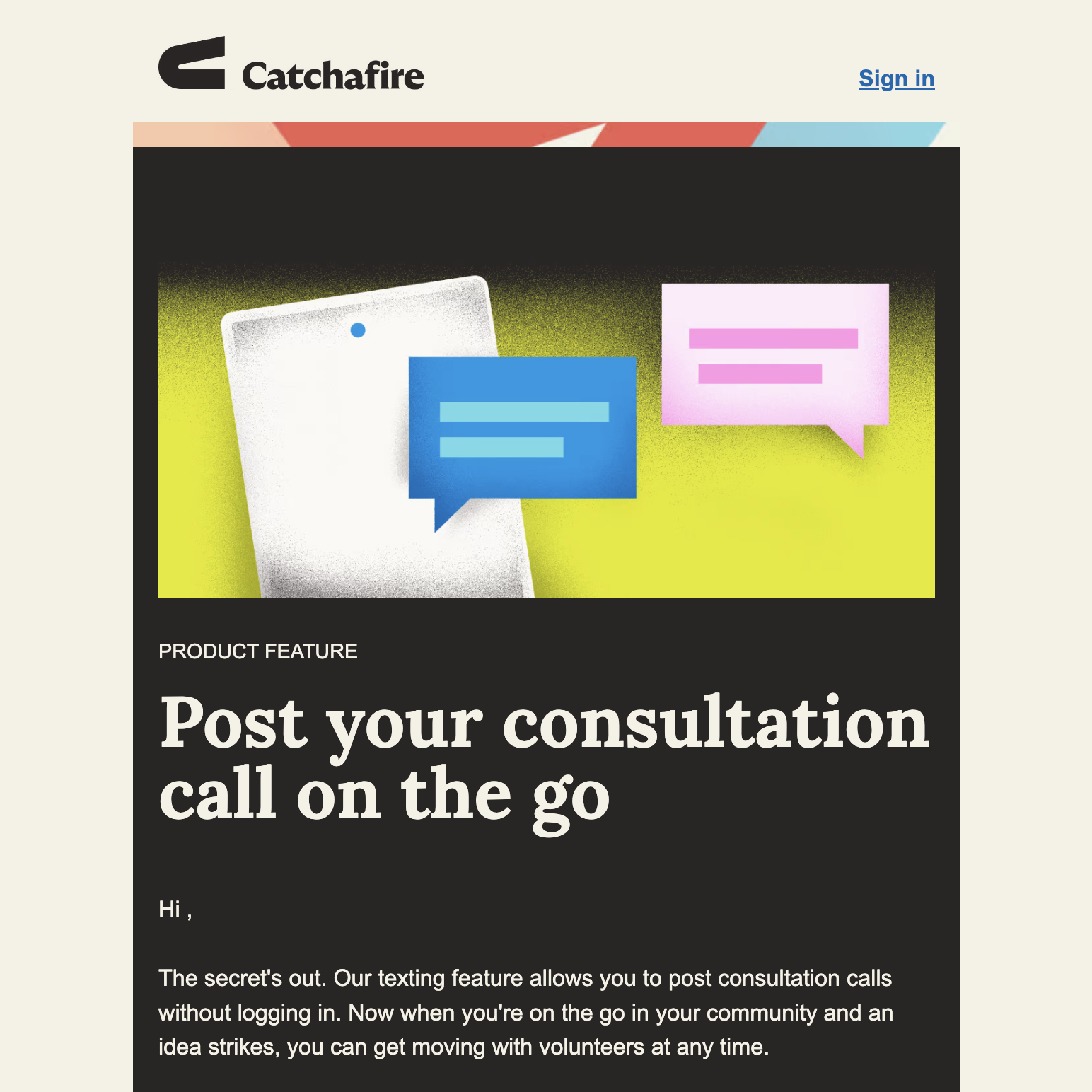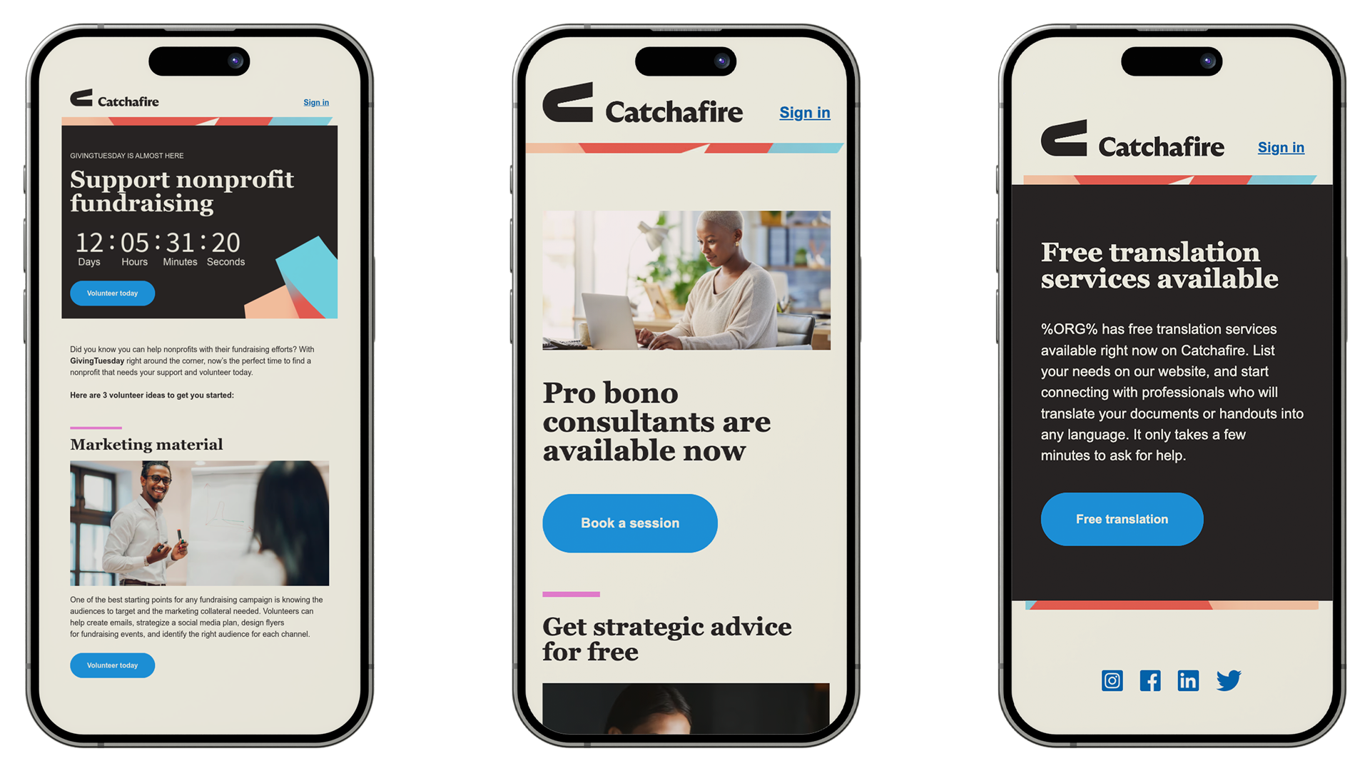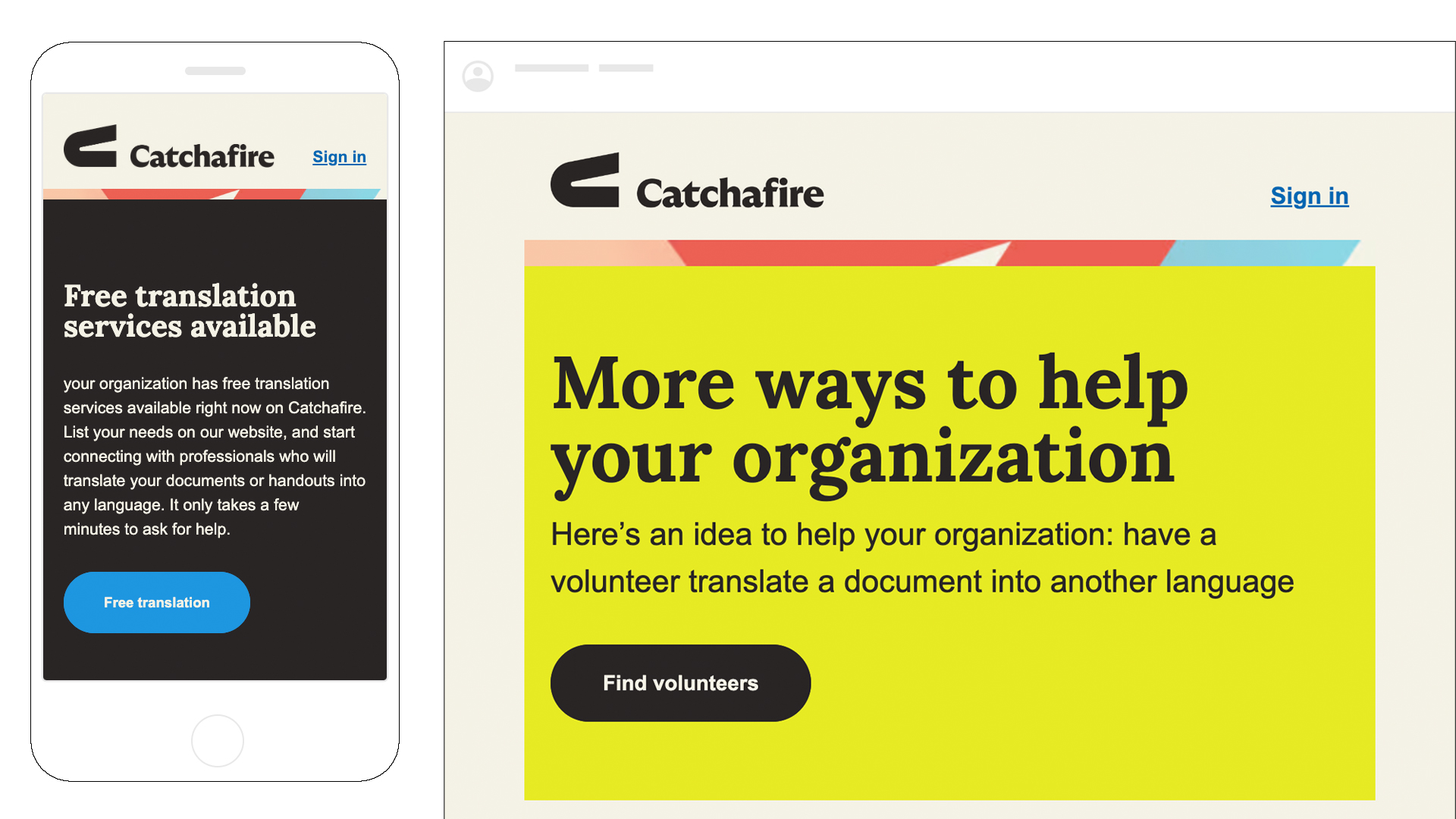 I created a short email series targeting lapsed and unengaged users, promoting the lowest barrier-to-entry project, Translation. Our hypothesis was short projects such as Translation would give users a taste of the value Catchafire offers, and they would be more inclined to use the platform for other projects.